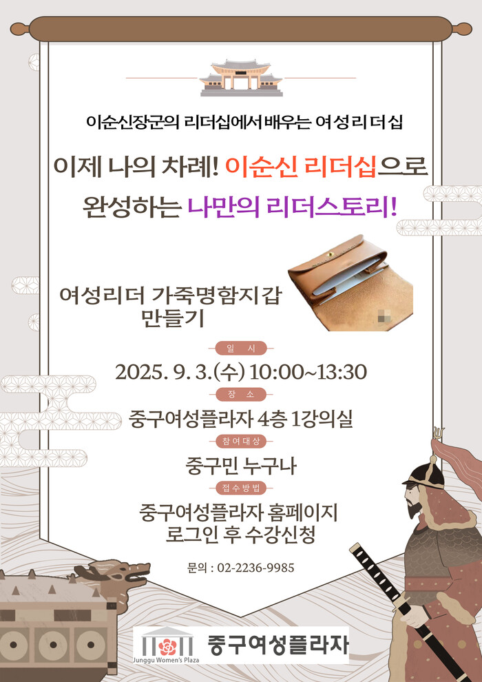 [시민일보 = 여영준 기자] 서울 중구가 오는 9월3일 오전 10시, 중구 여성플라자에서 <이순신 장군의 리더십에서 배우는 여성 리더십> 특강을 마련했다.
