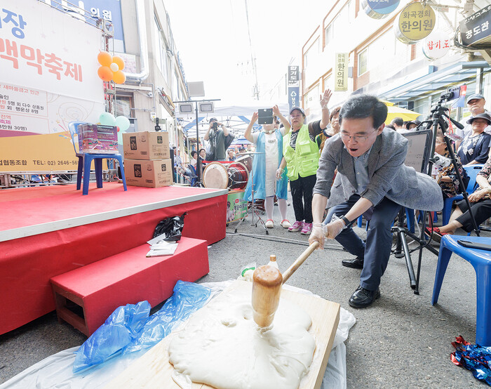 진교훈 서울 강서구청장이 최근 서울 낮 최고기온이 30도를 넘는 찜통더위에도 지역 곳곳을 다니며 주민과의 소통 행보를 이어갔다. 사진은 진 구청장이 화곡동 남부골목시장에서 열린 ‘맥(주)막(걸리)축제’에서 떡매치기 체험을 하는 모습. (사진=강서구청 제공)