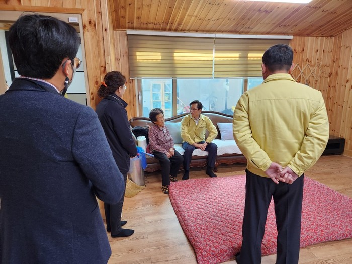 | ▲ 우승희 영암군수가 화재로 주거지를 잃고 임시거처에 기거하고 있는 화재 피해자를 위로하고 있다. / 사진=영암군 제공 |