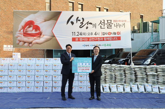 서울 금천구는 최근 시흥교회로부터 ‘2023 희망온돌 따뜻한 겨울나기’ 성품으로 김치와 쌀을 기탁받았다. 후원 물품은 한부모 가정과 차상위장애인 가구에 전달될 예정이다. 사진은 유성훈 구청장(오른쪽)이 기념촬영을 하는 모습. (사진제공=금천구청)