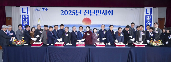 | ▲ 강기정 광주광역시장(왼 쪽부터 13번 째)이 15일 오후 광주테크노파크에서 열린 ‘지산학연 협의체 신년인사회’에 참석해 김영집 광주테크노파크 원장, 시의원, 입주기업 대표 등과 떡케이크를 자르고 있다./광주광역시 제공 |