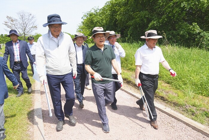 | ▲ 강기정 광주광역시장이 20일 오후 광산구 황룡친수공원에서 열린 ‘2024 광주 생물다양성의 달’ 행사에 참석해 박병규 광산구청장, 정무창 광주시의회 의장, 박연재 영산강유역환경청장 등 내빈들과 장록습지 정화활동을 하고 있다./광주광역시 제공 |