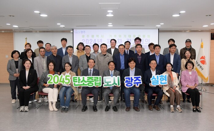| ▲ 강기정 광주광역시장(앞줄 가운데)이 23일 오후 시청 중회의실에서 열린 ‘2024년도 기후위기 대응위원회 회의’에 참석해 위원회 운영실적 보고를 받고 안건을 심의한 후 참석자들과 함께 기념촬영을 하고 있다. /광주광역시 제공 |