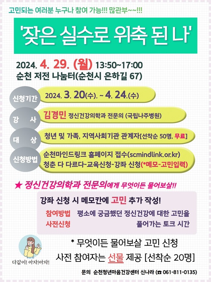 강좌는 누구나 무료로 참여할 수 있고 신청은 오는 24일까지 포스터(QR코드)와 순천마인드링크 홈페이지를 통해 선착순으로 50명까지 신청받을 예정이다.