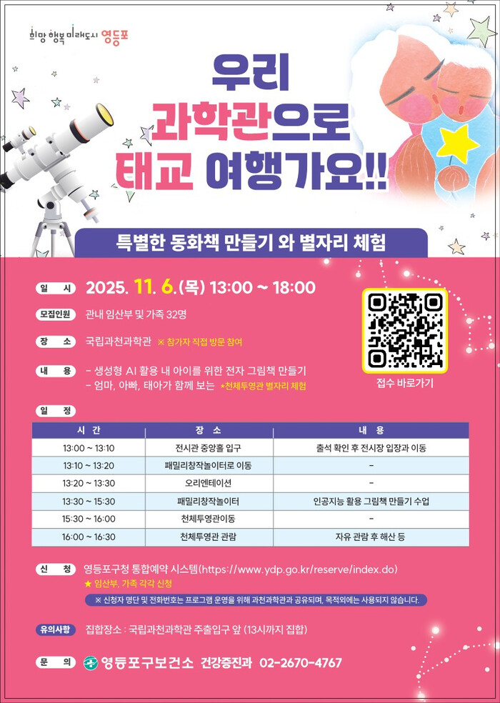 [시민일보 = 여영준 기자] 영등포구(구청장 최호권)가 예비 부모와 태아가 함께 교감하는 특별 체험 프로그램 ‘과천과학관 태교 여행’ 참여자를 모집한다고 밝혔다.