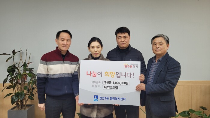 경기 수원시 권선구 권선2동에 소재한 공리대박고기집이 최근 복지사각지대에 놓인 어려운 이웃을 위해 사용해 달라며 후원금 100만원을 권선2동행정복지센터에 전달했다. 사진은 관계자들이 기념촬영을 하고 있는 모습. (사진=권선구청 제공)