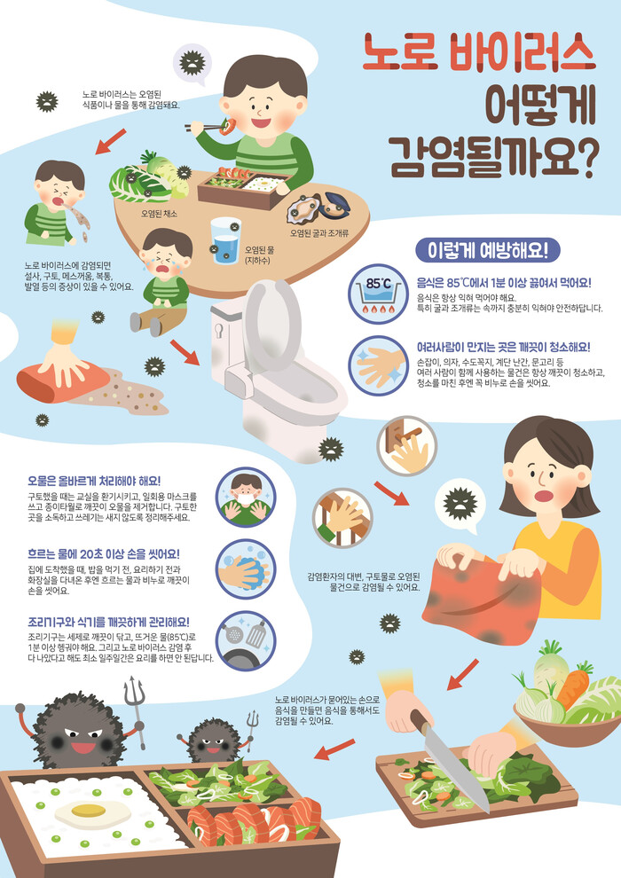 노로바이러스는 감염시 1~3일간 구토와 설사, 복통 및 발열과 탈수증상을 일으키며 낮은 온도에도 생존해 겨울철 유행하는 수인성ㆍ식품 매개 감영병이다.