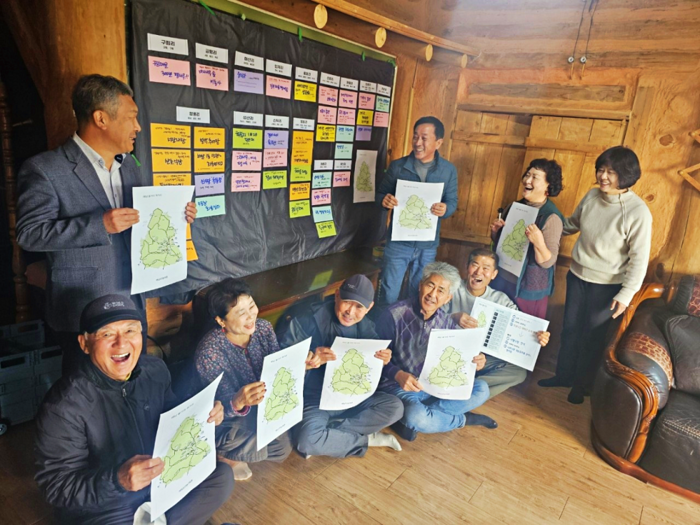 | ▲ 먹거리, 즐길거리, 포토존, 체험거리 등을 발굴해 손으로 그린 지도를 펼치고 있는 화원면민들 / 해남군 제공 |