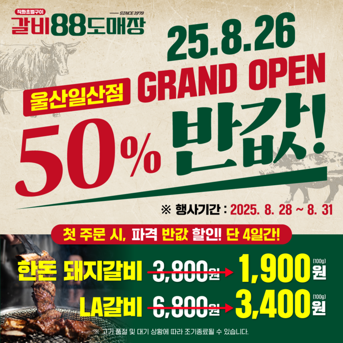 울산일산점은 매장 오픈을 기념하여 8월 28일 ~ 8월 31일까지 총 4일간 100% 1등급 한돈 돼지갈비 또는 LA 갈비 첫 주문 시 50% 반값 할인 혜택이 적용돼 한돈 돼지갈비 100g 1,900원, LA갈비 100g 3,400원으로 즐길 수 있다.