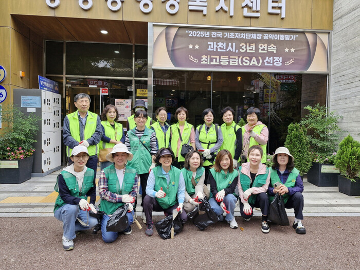 경기 과천시 중앙동이 최근 양일간 통장단, 새마을부녀회와 중앙동 10·11단지 일대에서 가로변 나무 가지치기와 제초 작업 등 환경정비 활동을 진행했다. 사진은 참여자들이 기념촬영을 하고 있는 모습. (사진=과천시청 제공)