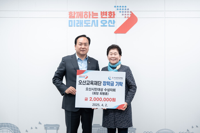 경기 오산시가 2일 오산시민대상 수상자회로부터 오산특기생 등 인재 육성을 위한 장학금 200만원을 기탁받았다. 사진은 기탁식에서 이권재 시장(왼쪽)이 관계자와 기념 촬영을 하는 모습. (사진=오산시청 제공)