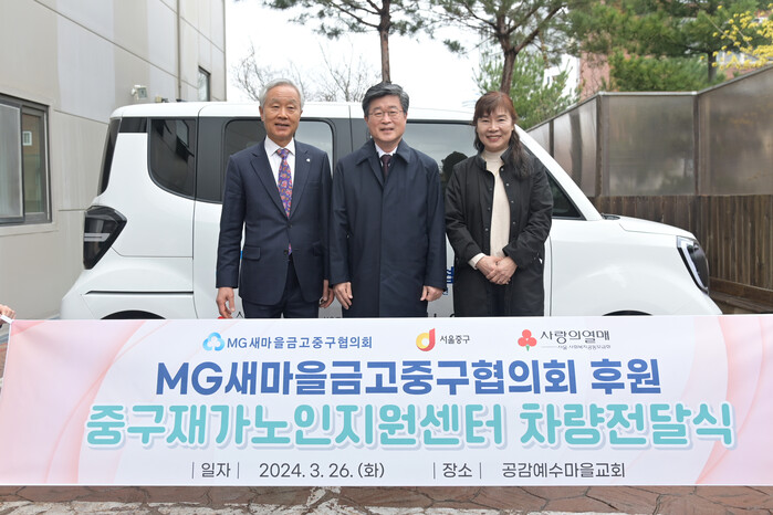 새마을금고 중구협의회가 서울 중구재가노인지원센터에 새 차량을 후원했다. 그간 재가노인지원센터는 낡은 차로 밑반찬 배달서비스 등을 추진해 왔으며 이번 새 차량 후원으로 재가노인지원센터의 노인복지 사업이 더욱 원활하게 추진될 전망이다. 사진은 26일 진행된 차량 전달식에서 김길성 구청장(가운데)이 관계자들과 기념촬영을 하고 있는 모습. (사진=중구청 제공)