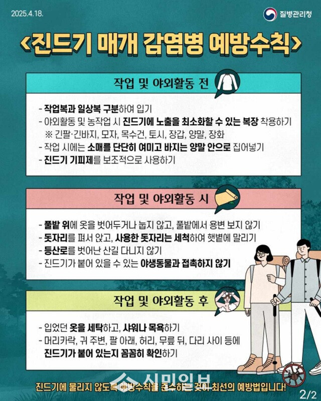 군 관계자는 “야외 활동 후 2주 이내 발열, 구토, 설사 등 증상이 나타나면 감기 몸살로 착각하기 쉽다”며 “증세가 나타날 시 즉시 의료기관을 방문해 성묘·벌초·농작업 등 야외활동 사실을 알리고 진료받는 것이 중요하다”고 강조했다.
