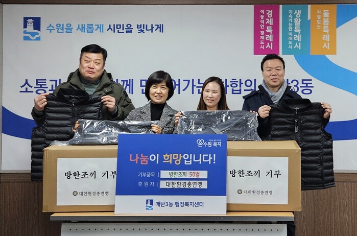 대한환경총연맹은 최근 경기 수원시 매탄3동행정복지센터를 찾아 어려운 이웃을 위한 발열조끼 50벌을 전달했다. 사진은 전달식에서 관계자들이 기념촬영을 하고 있는 모습. (사진=영통구청 제공)