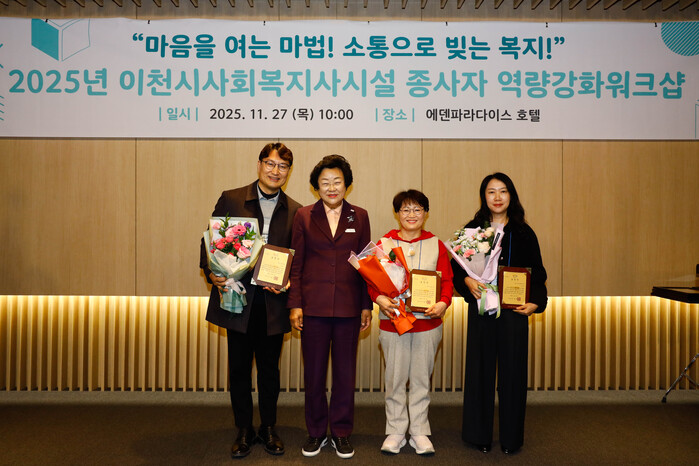 경기 이천시가 최근 에덴 파라다이스 그레이스홀에서 사회복지시설 종사자 80여명이 참석한 가운데 사회복지사 역량 강화 워크숍을 개최했다. 이번 워크숍은 사회복지 종사자들의 역량 강화 및네트워킹 강화를 위해 마련됐다. 사진은 김경희 시장(왼쪽 두 번째)이 표창을 받은 모범 사회복지 종사자과 기념 촬영을 하는 모습. (사진=이천시청 제공)