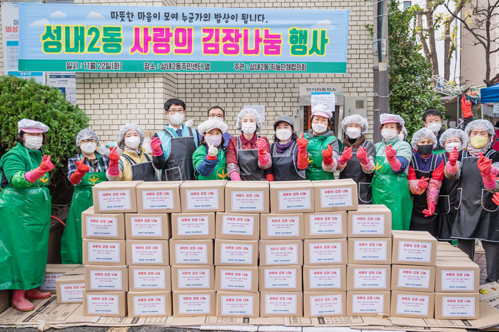 이수희 서울 강동구청장이 최근 겨울철을 대비해 성내2동 주민센터 김장 나눔행사에 참여해 취약계층에 전달할 김장김치를 담갔다. 사진은 이 구청장이 김장김치를 담그고 기념촬영을 하고 있는 모습. (사진제공=강동구청)