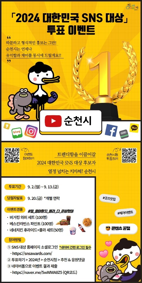 시 관계자는 “순천시는 SNS 채널을 통해 다양한 콘텐츠를 제작하여 국민들과 소통을 위해 노력하고 있다”며 “대한민국 SNS 분야에서 최고의 지자체로 선정될 수 있도록 투표에 많은 참여와 관심 부탁드린다”고 전했다.