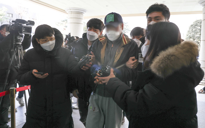마포구 주택가에서 40대 남성을 흉기로 살해한 혐의로 체포된 50대 남성 장모씨가 24일 오전 서울서부지법에서 열리는 구속 전 피의자 심문(영장실질심사)에 출석하고 있다.
