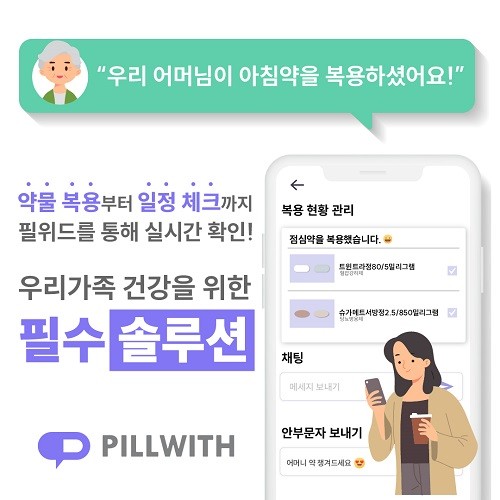 필위드는 사용자의 복약 일정을 주변 사람들과 함께 기록하고 공유할 수 있는 헬스케어 서비스다. 사용자가 지정한 시간에 의약품을 복용할 수 있도록 소리나 진동, 팝업 등 시각적으로 복약 일정을 알려준다.