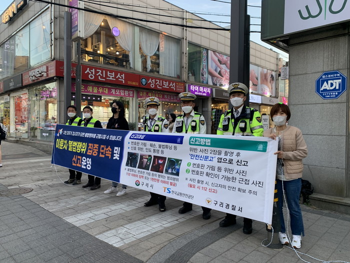 | ▲ 9일 진행된 이륜차 교통법규 위반 등 불법행위 일제 단속 현장에서 점검반이 안내 현수막을 들고 있는 모습. (사진제공=구리시청) |