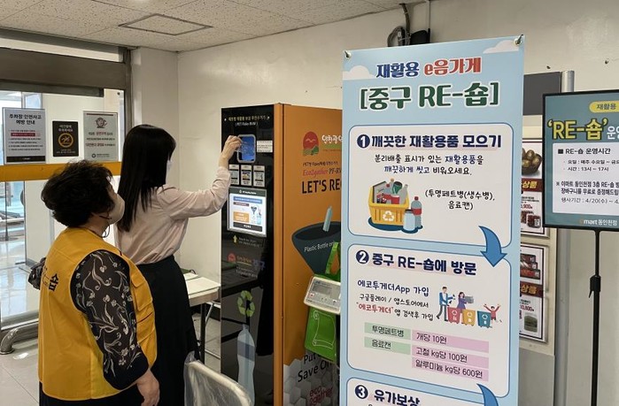 ‘중구 RE-숍’은 핸드폰번호 기반 사용자 인식을 통해 포인트를 제공하는 시스템으로 음료캔, 페트병 등은 각각 무게와 수량별로 포인트를 제공하며 한 달에 한 번 포인트를 현금으로 전환할 수 있다.