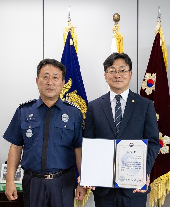 | ▲ 민찬혁 해남군의원(오른 쪽), 지난 2일 해남교도소에서 박성재 법무부 장관의 표창을 지경선 해남교도소 소장으로부터 전수(傳授)받고 기념촬영. / 해남군의회 제공 |