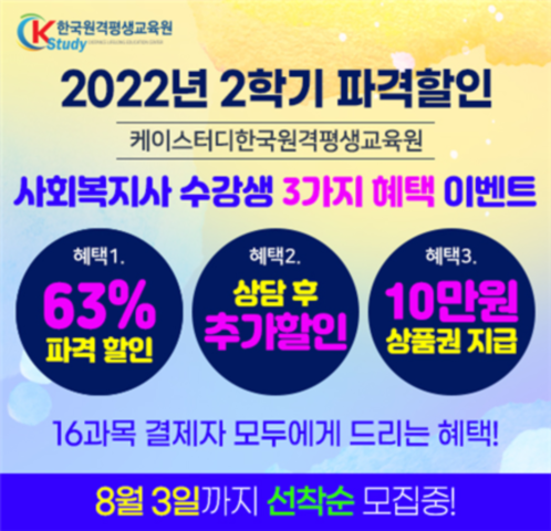 케이스터디는 학습자의 학습동기 부여와 학비부담을 줄여주기 위한 특별할인 이벤트를 진행한다. 수업료에 대한 할인은 물론 백화점 상품권 10만 원까지 지급한다.