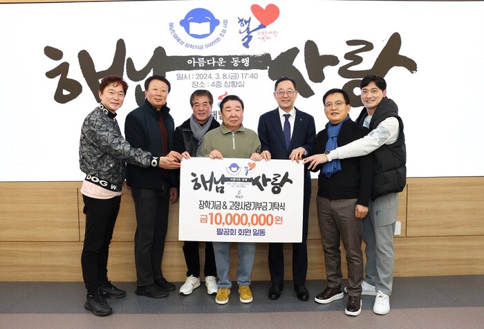 [해남=정찬남 기자] “팔십까지 팔팔하게 건강하자.”라는 취지로 기업인, 스포츠맨, 배우 등으로 결성된 팔공회(대표 김장호)가 11일 해남군청을 방문해 해남군 고향사랑기금 5백만 원과 장학사업기금 5백만 원, 총 1천만 원을 기탁했다.