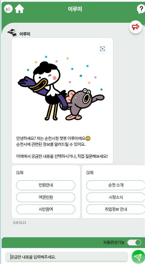 챗봇 전용 아이콘은 시 마스코트인 ‘루미와 뚱이’를 활용했고 사람과 자연이 공존하는 생태도시라는 의미를 담아 초록색으로 사용자환경(UI)을 구현했다.