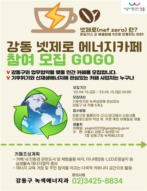 [시민일보 = 이대우 기자] 서울 강동구가 오는 15일까지 기후위기에 대응하고, 탄소 중립과 신재생에너지에 대한 주민 공감대 확산을 이끌기 위해 추진하는 ‘강동 넷제로 에너지카페’ 5곳을 공개모집한다.