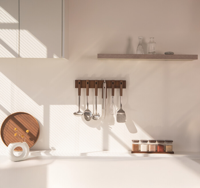 블랙월넛 원목과 스테인리스의 조화는 주방에 세련된 감성과 자연스러운 멋을 동시에 선사한다. 걸이 고리가 있어 벽에 걸어두기만 해도 인테리어 소품처럼 공간을 빛낸다.