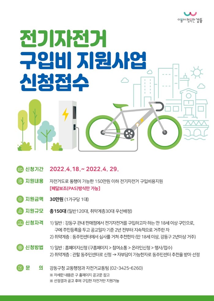 [시민일보 = 이대우 기자] 서울 강동구(구청장 이정훈)가 자전거의 교통수단 분담률을 제고하고 지역경제 활성화를 위해 ‘2022년 전기자전거 구매비용 지원사업’을 확대한다.