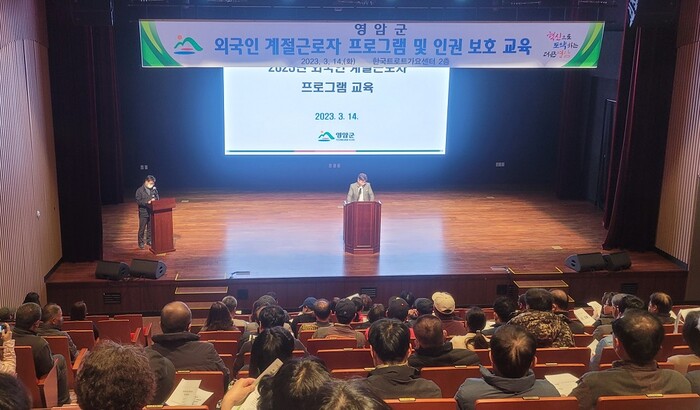 이날 교육은 올해 80농가, 220명 규모로 배정 예정인 외국인 계절근로자들의 입국을 앞두고 계절근로자 가족 170명과 고용주 80명 등을 대상으로 실시한 사전 교육으로, '외국인 계절근로자 프로그램 안내', '외국인 근로자의 인권·법률·생활안전 교육(전남인권교육 위촉강사 <이경자> 초빙)', '외국인 근로자의 통장 개설 안내(농협중앙회 영암군지부)' 순으로 진행됐다.