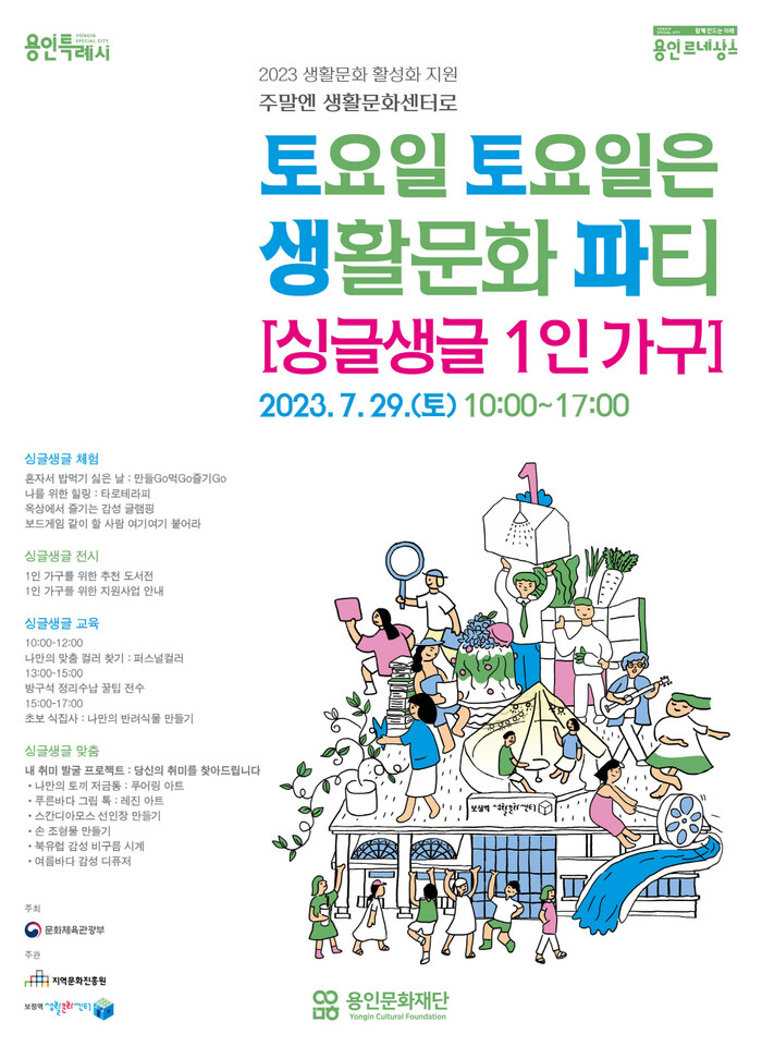 ‘토요일 토요일은 생활문화 파티-싱글생글 1인 가구’ 프로그램은 전체 무료 참여로 7월 21일부터 온라인에서 사전 접수가 진행되며, 잔여 인원에 따라 당일 현장에서도 신청 가능하다.