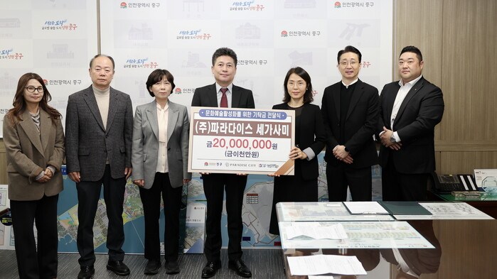 현금 기탁식은 지난 30일 오후 중구 제2청사 구청장실에서 김정헌 중구청장, ㈜파라다이스세가사미 배현미 상무이사, (재)인천중구문화재단 사무국장 등이 참여한 가운데 진행됐다.