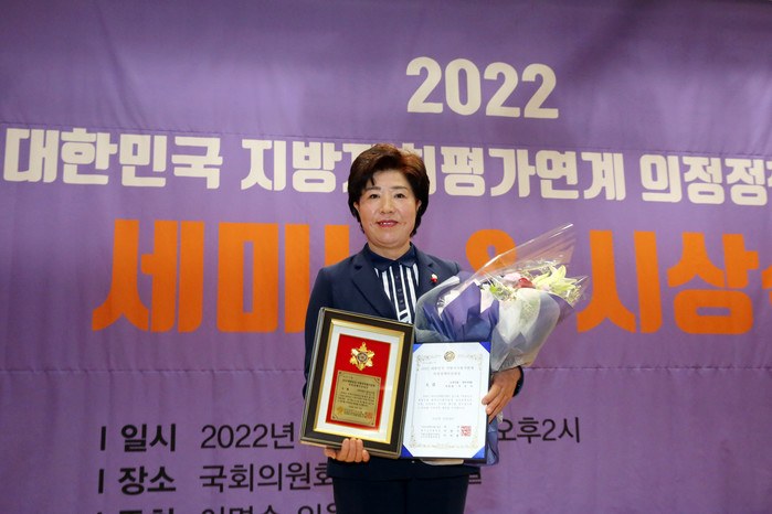 | ▲ '2022대한민국 지방자치평가연계 의정정책비전대상'에서 대상을 수상한 주순자 의원이 기념촬영을 하고 있다. (사진=주순자 의원 제공) |