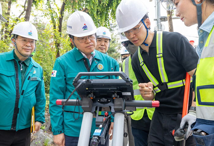 진교훈 구처장이 최근 가양아파트 일대에서 진행 중인 ‘도로 하부 공동(空洞) 조사’ 현장을 찾았다. 최근 잇따라 발생하고 있는 도로함몰 사고로 인해 사전 예방과 신속한 대응이 중요해지면서 도로 하부 탐사 과정을 직접 챙기기 위한 행보다. 사진은 진 구청장(왼쪽 두 번째)이 보도형 지표투과레이더(GPR)를 활용한 탐사 과정을 살펴보는 모습. (사진=강서구청 제공)
