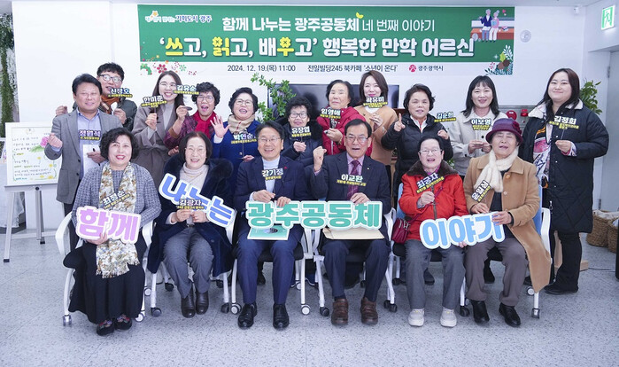 | ▲ 강기정 광주광역시장(앞줄 왼 쪽부터 세 번째)이 19일 오전 동구 전일빌딩245 1층 북카페 ‘소년이 온다’에서 열린 ‘함께 나누는 광주공동체 네번째 이야기’에 참석해 만학 어르신들과 문해교육 경험담을 공유한 뒤 기념촬영을 하고 있다./광주광역시 제공 |