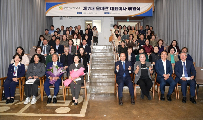 [광주=정찬남 기자] 강기정 광주광역시장(사진 앞줄 왼 쪽부터 세 번째)이 23일 오전 여성가족재단 소극장에서 열린 제7대 오미란 광주여성가족재단 대표이사 취임식에 참석해 임명장을 수여한 후 기념촬영을 하고 있다. /광주광역시 제공