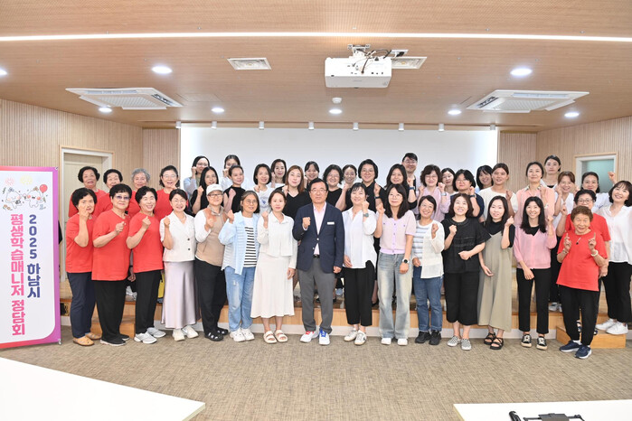경기 하남시가 25일 하남시평생학습관에서 ‘2025 평생학습매니저 정담회’를 열고, 현장의 목소리를 직접 듣는 소통의 자리를 마련했다. 사진은 이 시장(앞줄 가운데)이 참석자들과 기념 촬영을 하는 모습. (사진=하남시청 제공)