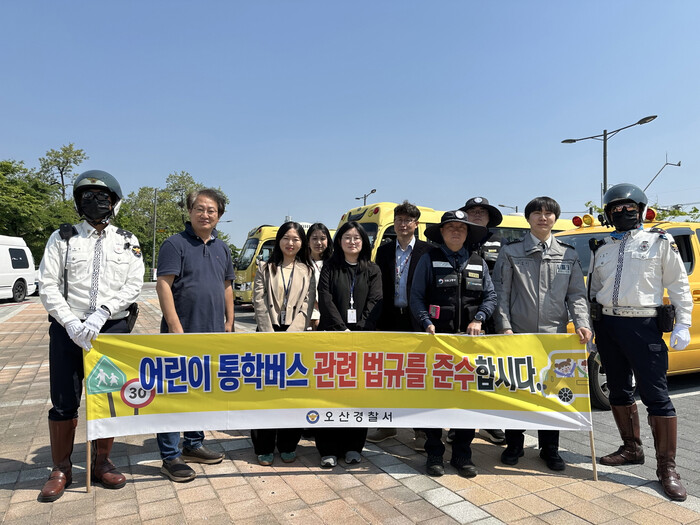 경기 오산시가 최근 삼미공영주차장에서 지역내 어린이집 통학버스를 대상으로 관계기관 합동 안전점검을 실시했다. 사진은 점검에 참여한 관계자들이 기념 촬영을 하는 모습. (사진=오산시청 제공)