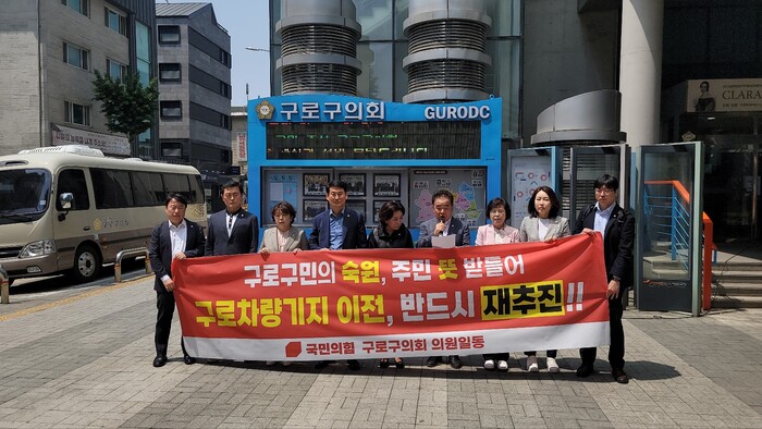 [시민일보 = 이대우 기자] 서울 구로구의회 국민의힘 구의원 9명이 최근 구의회 앞 광장에서 구로구민의 숙원사업인 구로차량기지 이전을 주민의 뜻 받들어 반드시 재추진하겠다는 성명서를 발표했다.
