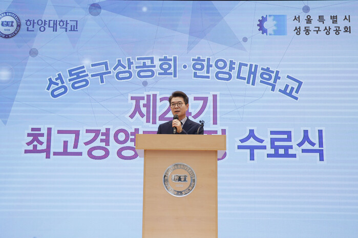서울 성동구가 최근 한양대학교 HIT관 6층 대회의실에서 ‘제24기 최고경영자과정 수료식’을 개최했다. 사진은 수료식에서 정원오 구청장이 인사말하는 모습. (사진=성동구청 제공)
