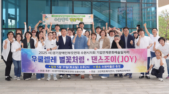 (사)경기장애인부모연대 수원시지회가 최근 수원박물관 야외 중정에서 발달장애인 문화예술 공연을 진행했다. 사진은 행사에 참석한 이재준 시장이 관계자들과 기념 촬영을 하는 모습. (사진=수원시청 제공)