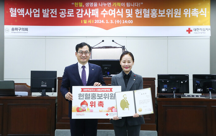 [시민일보 = 이대우 기자] 김영심 서울 송파구의회 의원(잠실본동, 잠실2·7동)이 대한적십자사 서울남부혈액원으로부터 혈액 사업 발전 공로를 인정 받아 감사패를 수여 받고 헌혈홍보위원으로 위촉됐다.