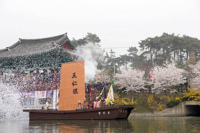 | ▲ 사진은 지난 2019년 왕인문화축제 왕인박사 일행들이 상대포에서 일본으로 출항하고 있는 모습 / 영암군 제공 |