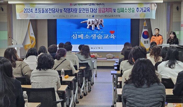 | ▲ 해남교육지원청, 27일 해남교육지원청 대회의실에서 관내 초등돌봄전담사·운전원 및 미이수 교직원 대상 심폐소생술 및 응급처치 교육 / 해남교육지원청 제공 |