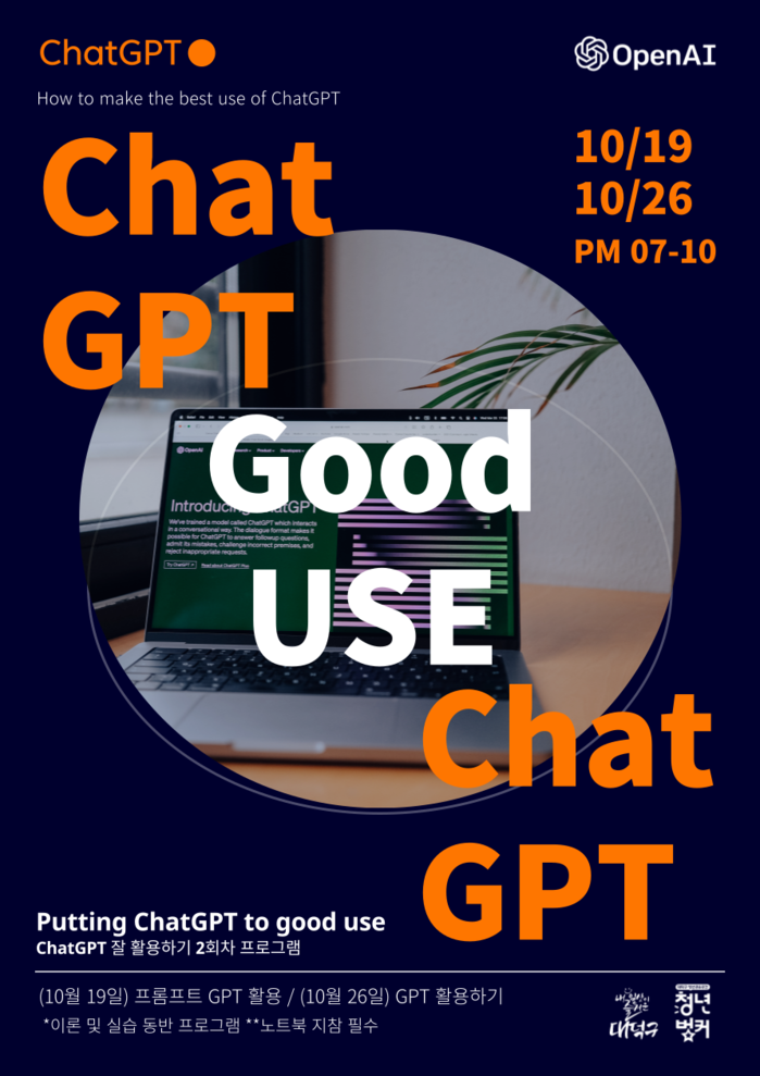 청년벙커는 인공지능에 대한 청년들의 많은 관심에 10월에도 인공지능 활용 프로그램을 추가 편성했다. 19일과 26일 2회로 진행되는 ‘Chat GPT 잘 활용하기’ 프로그램이 진행된다. 대덕구 청년을 포함한 청년이라면 누구나 참여할 수 있으며 신청폼을 통해 참가신청을 받고 있다.