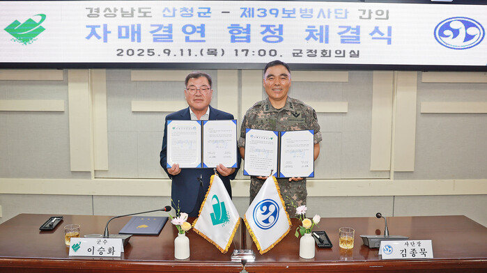 경남 산청군은 11일 군청 군정회의실에서 육군 제39보병사단과 자매결연 협정 체결했다. 체결식에는 이승화 산청군수, 김종묵 39사단장을 비롯해 산청군, 육군 관계자들이 참석했다. 사진은 체결식에서 이승화 군수(왼쪽)와 김종묵 39사단장이 기념촬영을 하고 있는 모습. (사진=산청군청 제공)