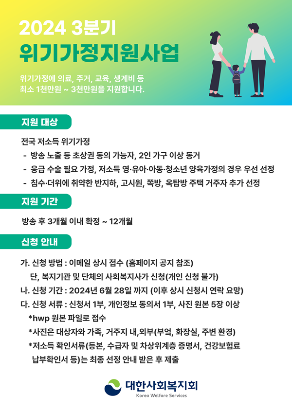 | ▲ 대한사회복지회, 2024년 3분기 위기가정 지원사업 신청 포스터 |